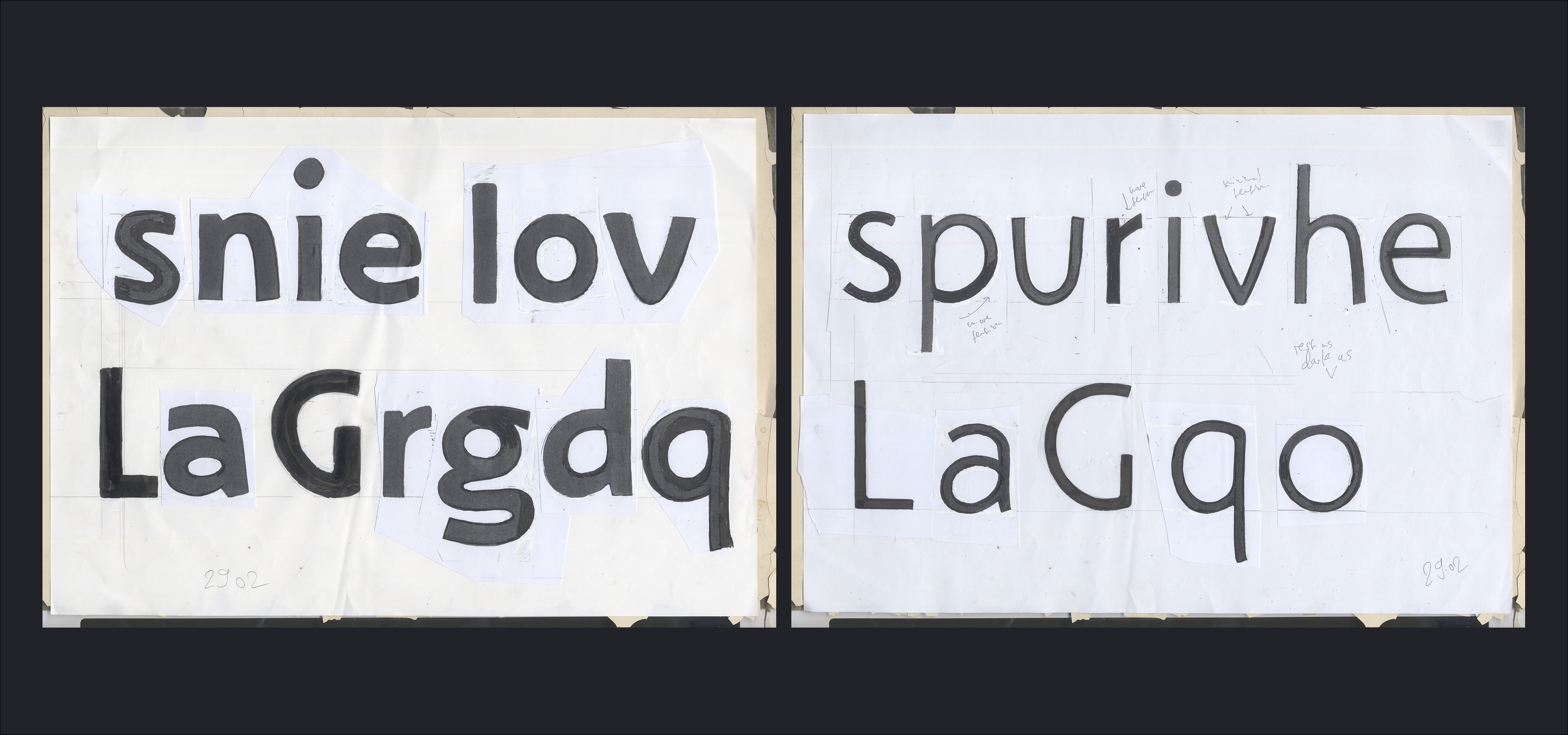 During my studies, I had drawn smaller alternate lowercase letters to create space to accommodate diacritics, so these could be big and stay within the vertical bounds of the typeface. I got rid of that idea and opted for smaller, simplified diacritics, somewhat more abstract than usual, which is fine for a display typeface.