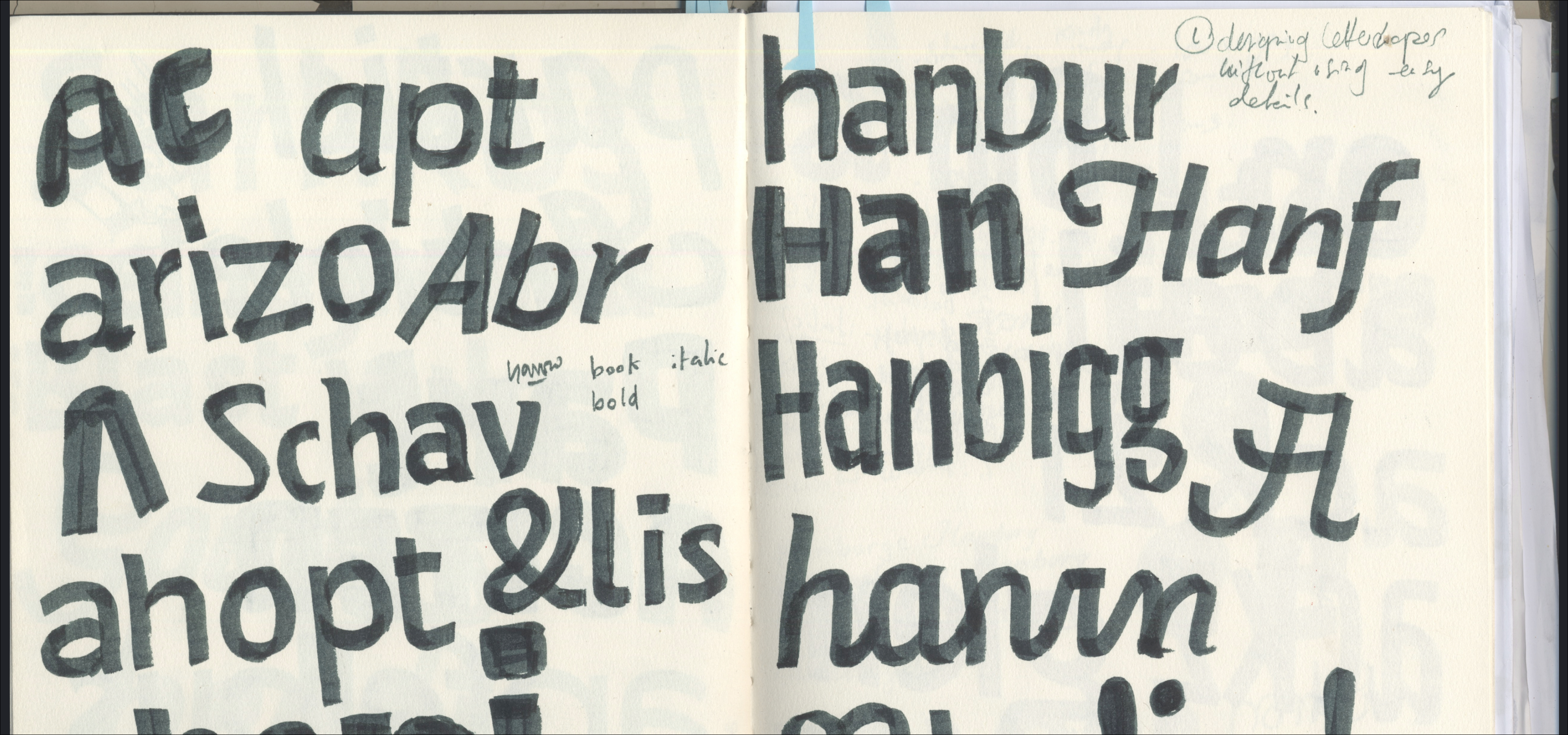 One idea I kept coming back to was that of a simple but impactful sans. Having previously worked as a letterpress printer at p98a, I had handled a lot of Bethold’s Block and Akzidenz Grotesk, which had really caught my eye. I love the straight-forwardness of these typefaces and my first sketches were strongly influenced by them.