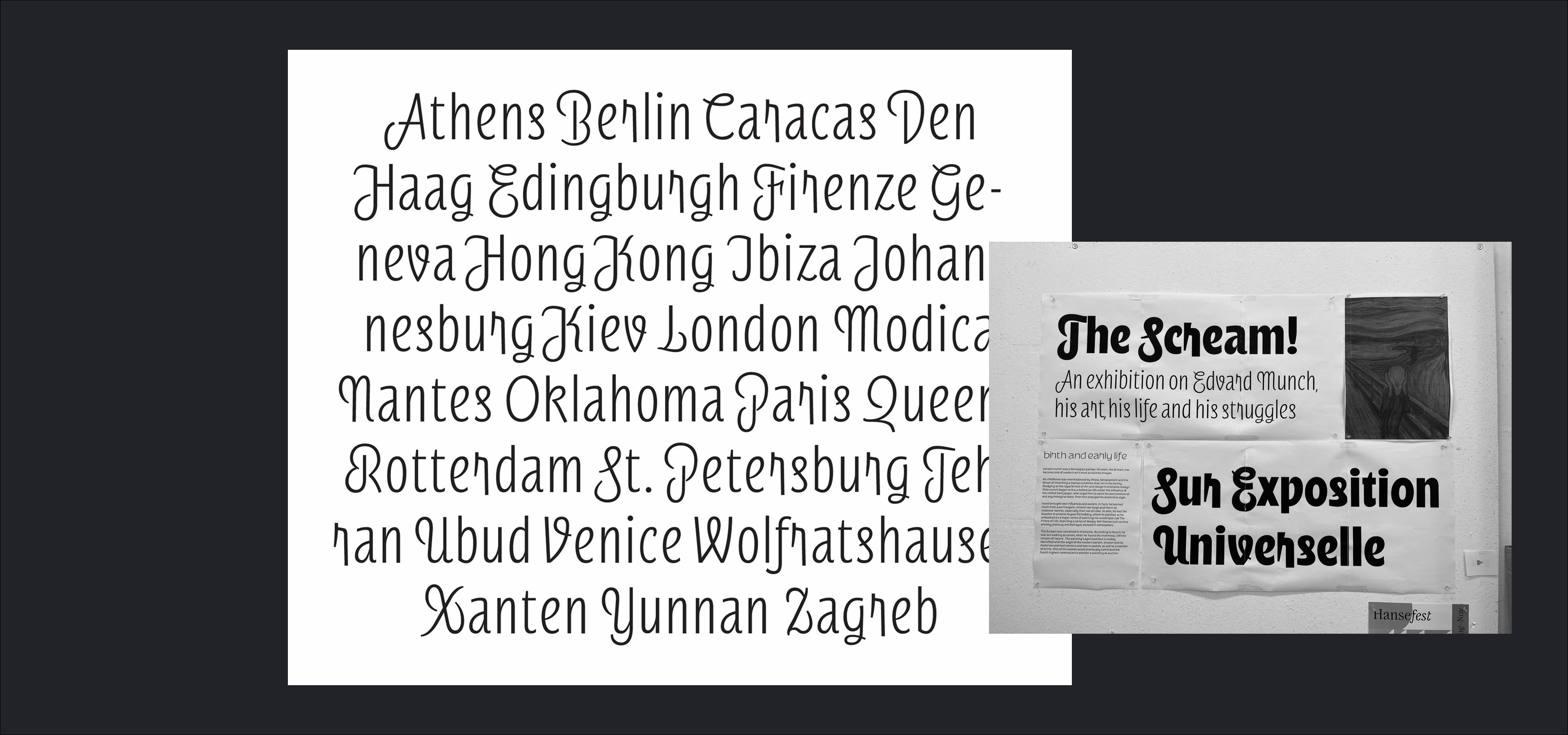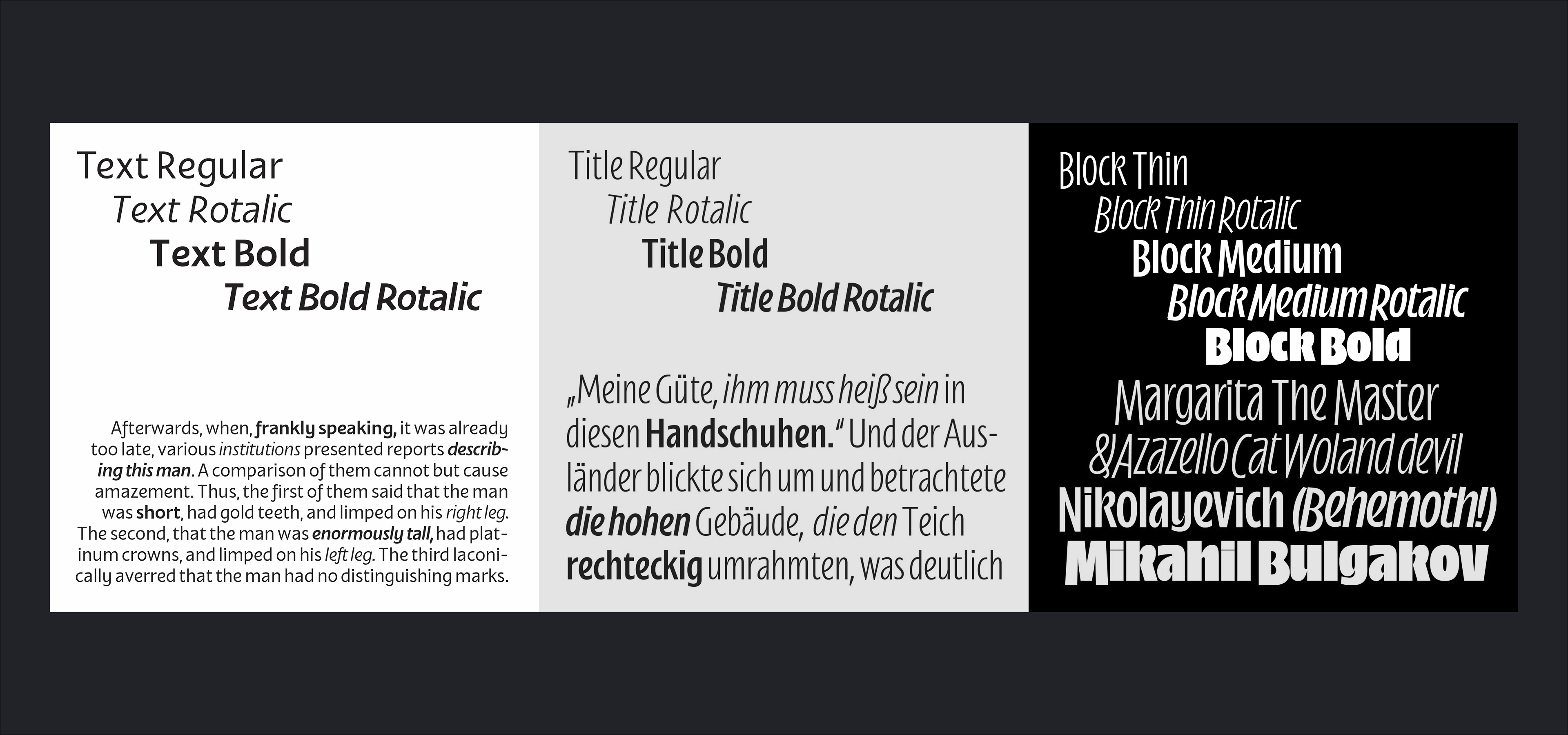 My task then became to think more about the design of the family itself than the letter shapes. I wanted to create a large family that spread the core design over a "text" group, for reading longer texts, a "titling" group with more slender and high waisted letters, and a "display" group with a huge x-height and capitals that would occupy as much space as possible by descending below the baseline. For each group, I wanted several weights, at least covering regular and bold, complemented by italics. I wasn’t interested in drawing those italics from scratch, Instead, I decided to apply my newly acquired python skills to create a pipeline to automate that process partially, rotating all outlines instead of slanting them, and then refining them by hand. As Typemedia projects tend to be, I was able to create a solid prototype, but far from finished.