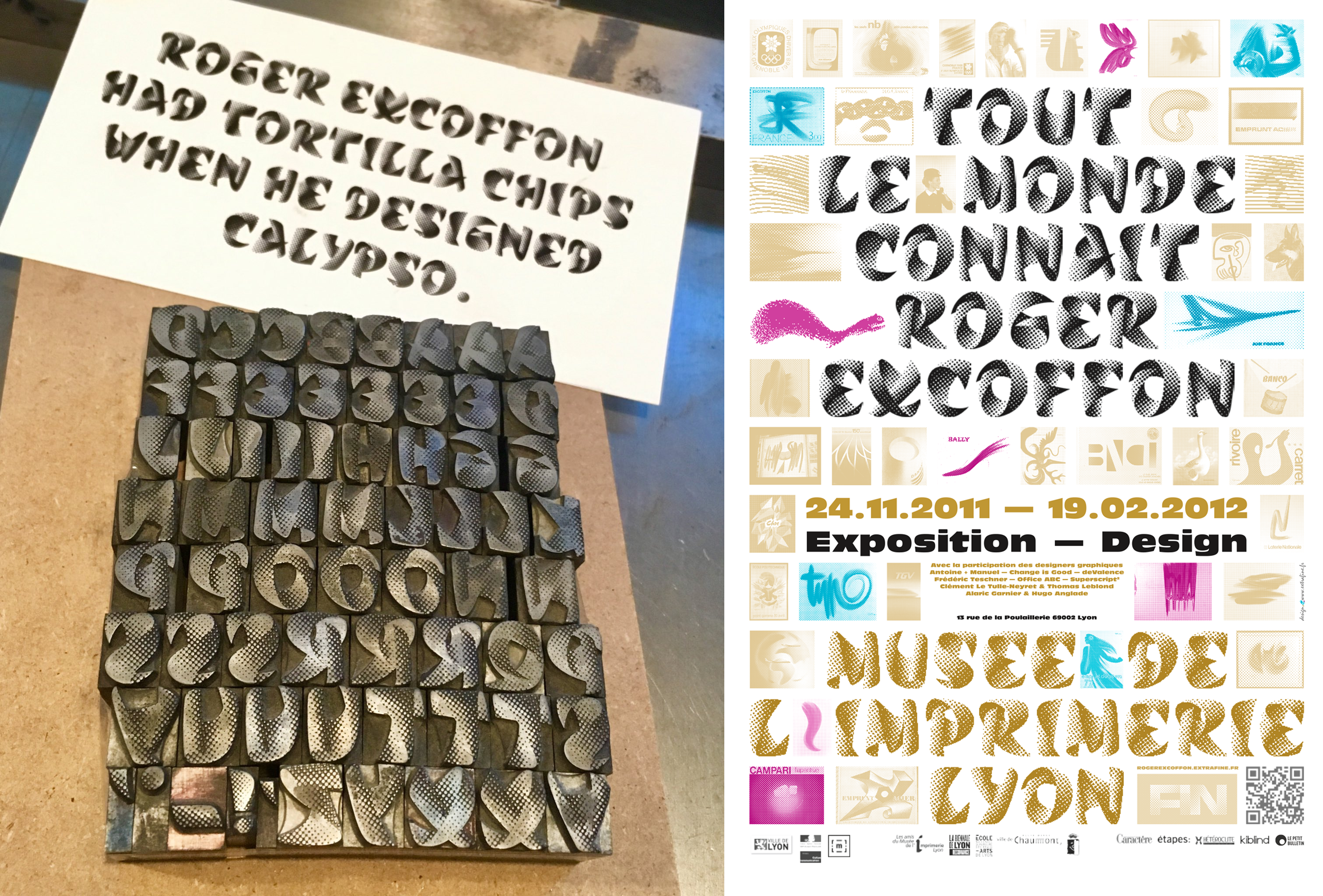 During my year and a half as a letterpress printer at p98a, a formative time that really opened my eyes to the world of fonts, I had access to a plethora of rare and beautiful fonts. One, that really struck me, was Calypso by Roger Excoffon: Calypso is an insane “trompe l’oiel” of a font, pretending to fold in over itself. The effect of depth is created by the smart use of halftones, which is basically the representation of gray scale gradients through a grid of dots of different sizes.