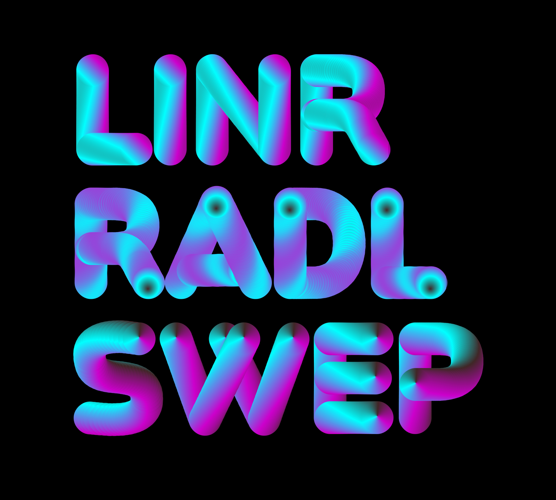BM Neon is an experimental font system that pushes the boundaries of our aesthetic and technological expectations of digital fonts. Using a tailored production pipeline that combines parametric drawing, variable font technology and the Opentype COLRv1 table, this system provides users with a total of three variable COLR font files: LINR, RADL and SWEP. Each file is built using a specific type of gradient, which can be manipulated via different variable axes, allowing for a multitude of visual results in both still and moving settings.